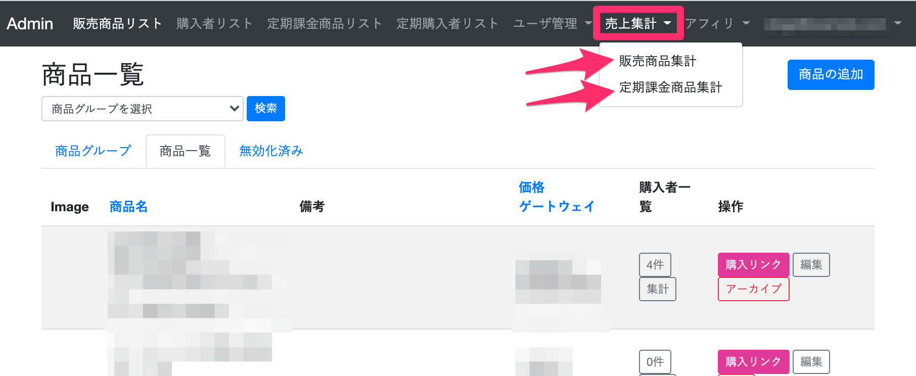売上集計では、販売商品の集計結果と定期課金商品の集計結果が確認できます。
