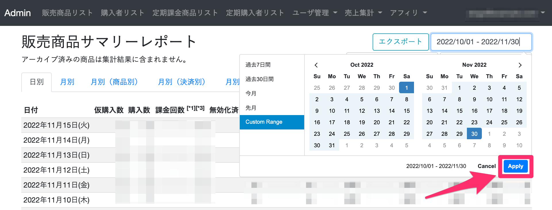 任意の期間を指定したら右下の青いボタン「Apply」を押しましょう。