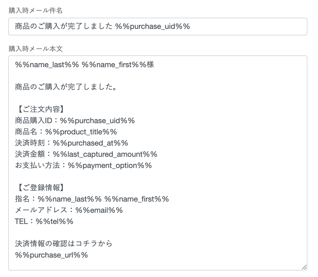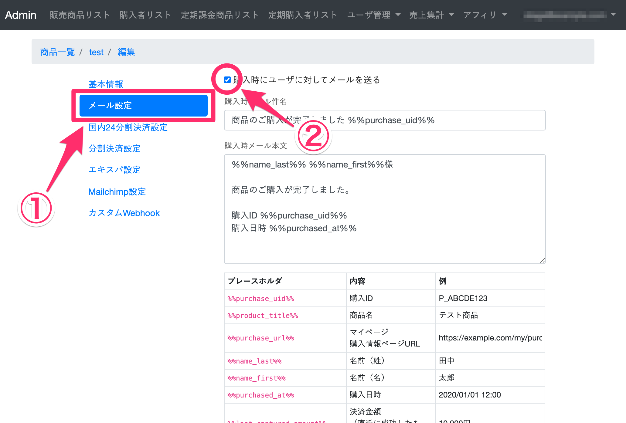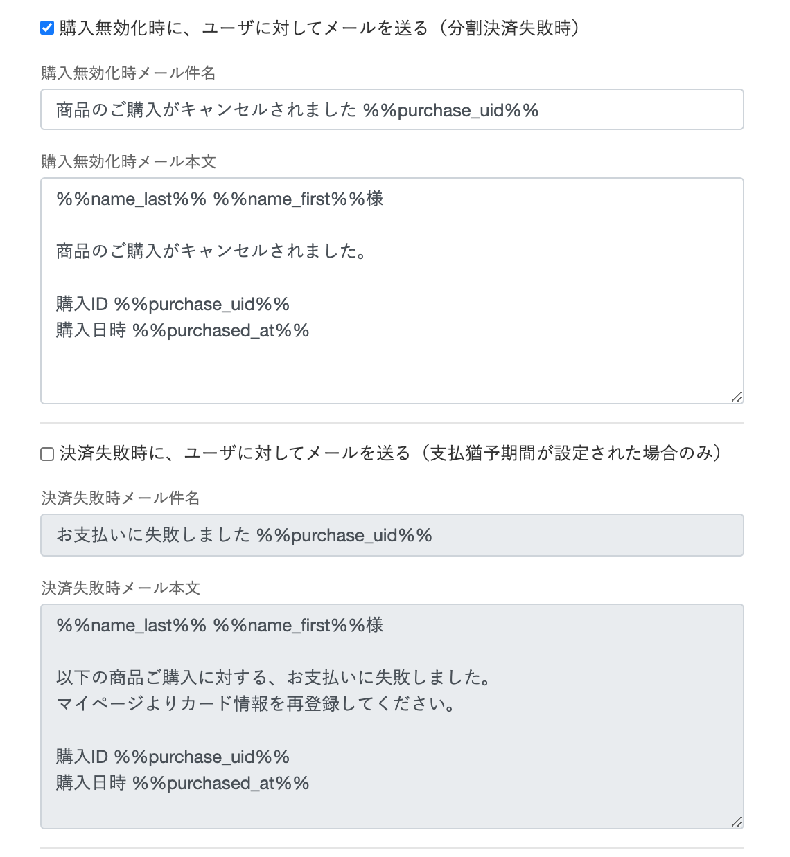 購入時や決済失敗に送られてくるメールなどの設定ができます。