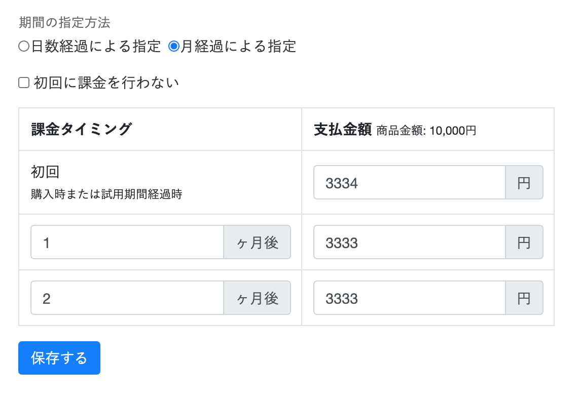 初回無料にしたい場合は「初回に課金を行わない」のチェックボックスにチェックを入れましょう。