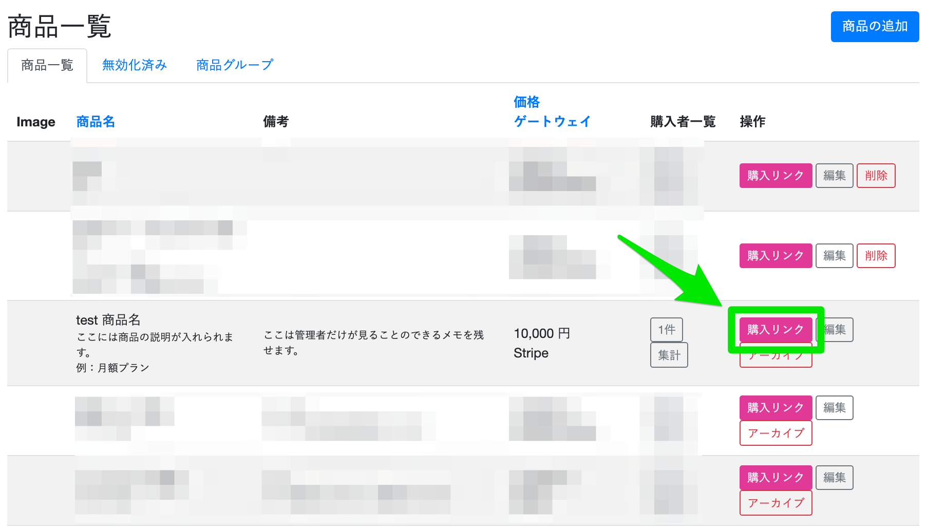 購入者側からどう見えているかを確認したい場合は、商品一覧ページで該当商品の「購入リンク」を押せば確認できます。