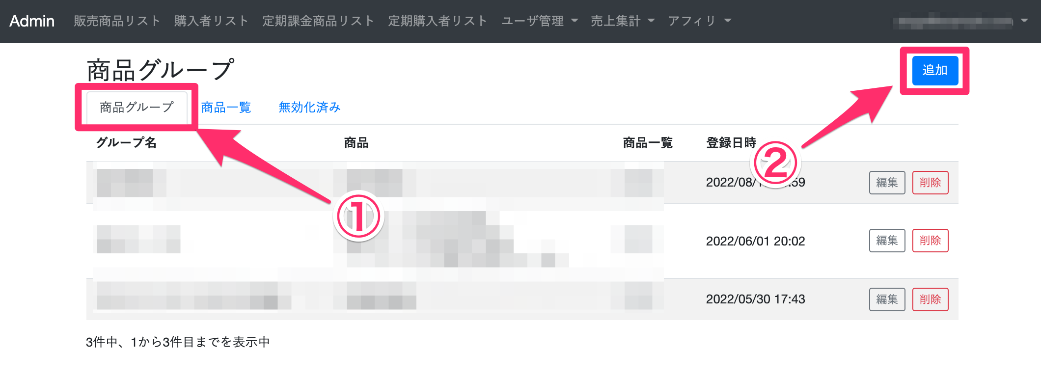 タブの「商品グループ」をクリックし(画像①)、右上の「追加」ボタンをクリックします(画像②)。